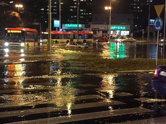 Autobusy i samochody brną w wodzie po burzy w Lublinie