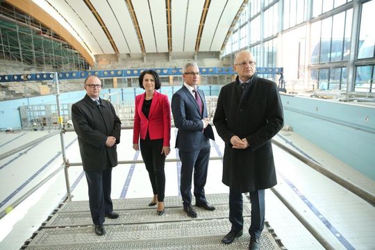 20 kwietnia 2015. Budowa Aqua Lublin i basenu olimpijskiego. Od lewej wojewoda Wojciech Wilk, posłanka Magdalena Gąsior-Marek i minister sportu Andrzej Biernat