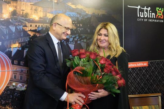 02.10.2020 Lublin ul. Rynek. Urząd Miasta. Konferencja prasowa z udziałem Beaty Kozidrak i prezydenta Krzysztofa Żuka poświęcona realizacji filmu biograficznego artystki.
