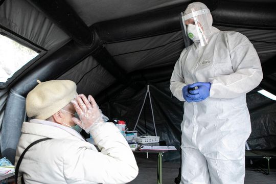Medyk z "czerwonej strefy" oddziału ratunkowego w SPSK 4 w Lublinie podczas rozmowy z pacjentką.