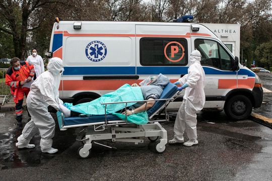 Medycy z "czerwonej strefy" oddziału ratunkowego SPSK 4 podczas transportu pacjenta.