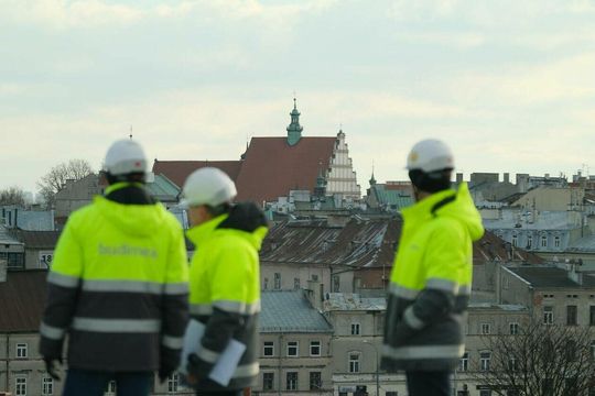 Prace wykończeniowe w nowym budynku szpitala SPSK 1 i panorama miasta z lądowiska