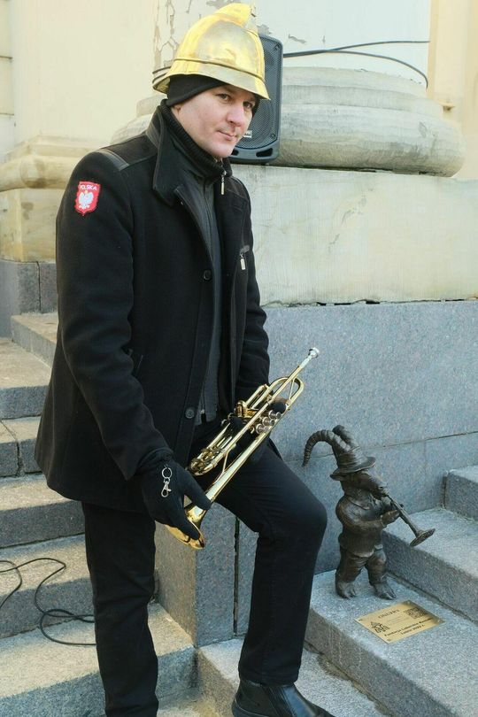 Zdjęcie: Koziołek Onufry gra na schodach ratusza