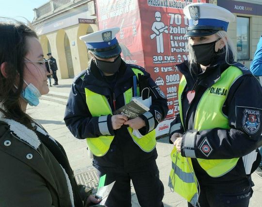 Policjanci z drogówki wspólnie z WORD Lublin rozdawali przechodniom opaski odblaskowe