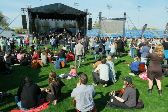 Gitarzyści grają Hey Joe na stadionie w Lublinie