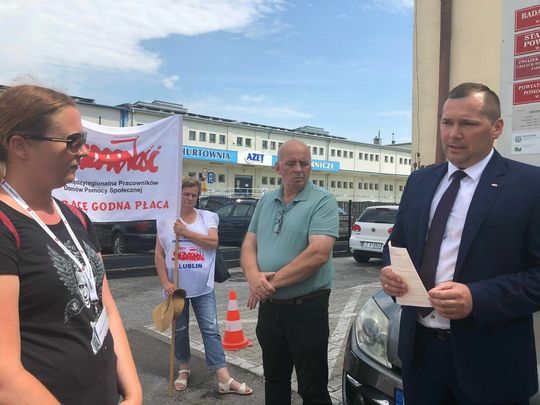 Protest związkowców z DPS przed Starostwem Powiatowym w Zamościu