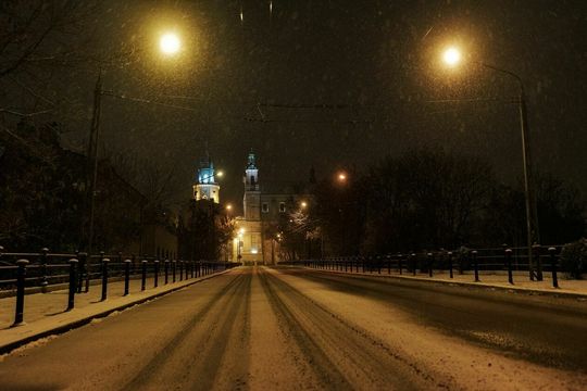Lublin nocą podczas opadów śniegu