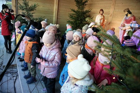 Kolęda dzieci z przedszkoli Król Maciuś I i II w szopce miejskiej
