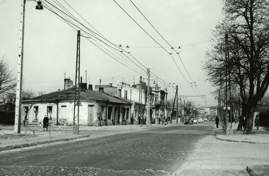 Ul. Kunickiego. Skrzyżowanie z ul. Wyścigową. W tle istniejąca obecnie kamienica przy ul. Kunickiego 79