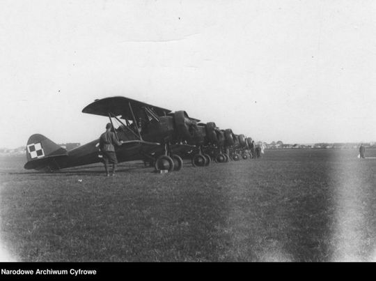 Komendant Centrum Wyszkolenia Oficerów Lotnictwa w Dęblinie ppłk obs. Stefan Sznuk (w oddali) wypuszcza do lotu pierwsze samoloty typu PWS 26 (rok 1937)