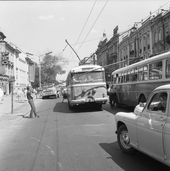 Kierowca podłączający trolejbus do linii trakcyjnej na Krakowskim Przedmieściu w Lublinie
