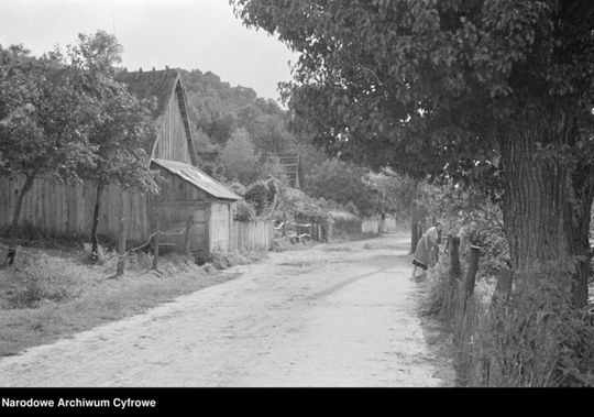 Ulica Krakowska w Kazimierzu Dolnym. Widoczne drewniane domy i kobieta przy płocie.