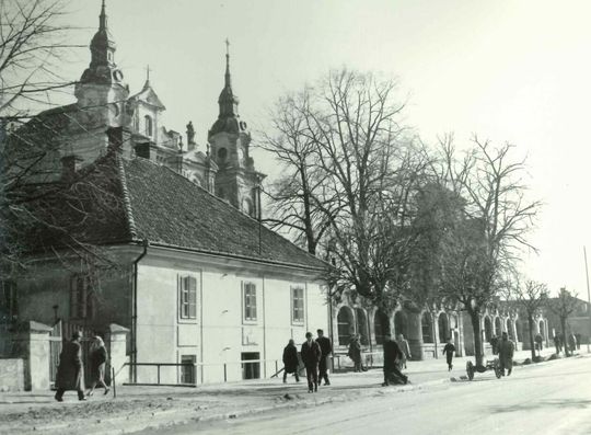 Lubartów, widok na plebanię i ogrodzenie kościelne z kościołem w tle od ul. Słowackiego