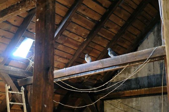 Strych kamienicy przy ul. Rynek 13 opanowany przez gołębie