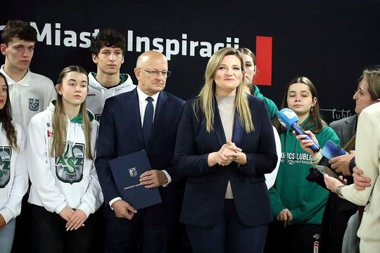 Konferencja prasowa Krzysztofa Żuka z udziałem lubelskich sportowców, dotycząca działań miasta na rz