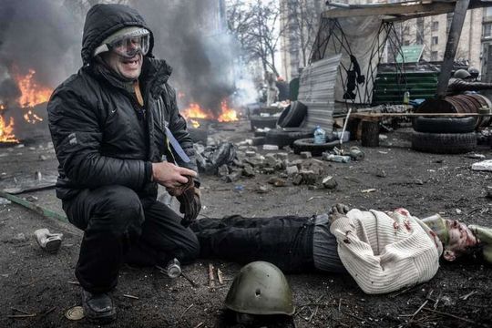 ZDJĘCIE ROKU 2014, ZDJĘCIE 10-leciaKijów. „Czarny czwartek” – pod taką nazwą przeszedł do historii Ukrainy 20 lutego 2014 roku, kiedy doszło do największych walk między antyrządowymi demonstrantami a ukraińskimi siłami bezpieczeństwa. Protesty zwolenników integracji europejskiej Ukrainy przeciwko rządom prezydenta Wiktora Janukowycza trwały na Majdanie Niepodległości od listopada 2013 roku – w lutym przybrały najbardziej krwawy obraz. Wojsko, policja i snajperzy strzelali do demonstrantów, tego dnia w starciach z siłami bezpieczeństwa zginęło ok. 70 osób. Na zdjęciu jedna z ofiar – mężczyzna biegł nieuzbrojony na czoło barykady, chcąc rzucić oponę, gdy kula snajpera przeszyła jego hełm i głowę na wylot. 20 lutego 2014