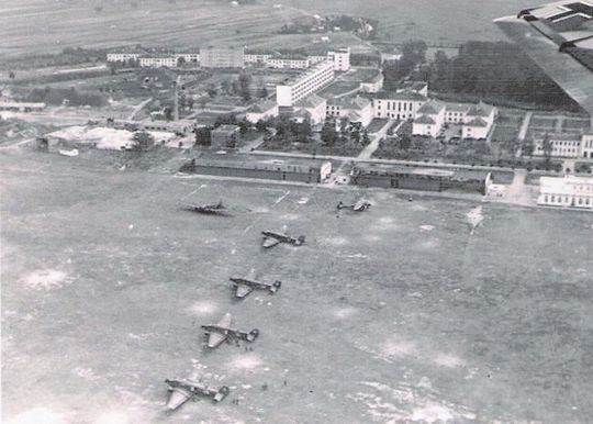 Dęblin-lotnisko w czasie II wojny światowej. Widać stojace trzysilnikowe Junkersy JU-52.
