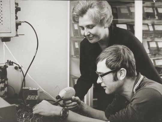Mgr inż. Barbara Podkowa i mgr Kawęcki w laboratorium elektroniki, lata 70.