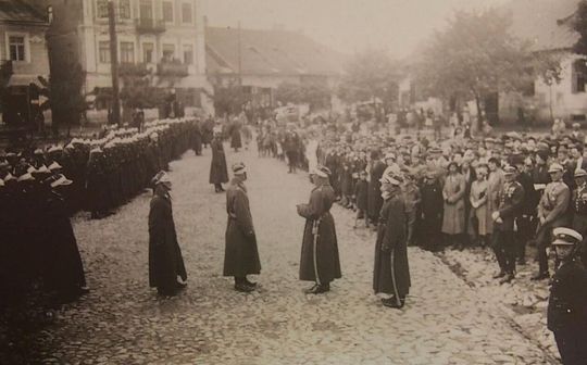 Przed defiladą. Przodem do szyku stoi dowódca Pułku ppłk Kazimierz Halicki, za nim adiutant por.Jan Kański.