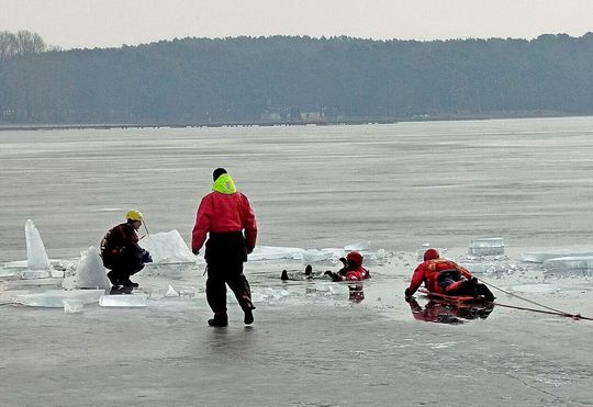Ćwiczenia strażaków na zamarzniętym Zalewie Zemborzyckim