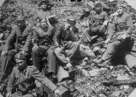 Grupa żołnierzy Polskiej Podziemnej Armii Niepodległościowej, m.in. ks. Władysław Gurgacz ps. Sem oraz Stanisław Pióro ps. Emir, fot. AIPN, sygn. IPNKr-3-3-6-24-1.