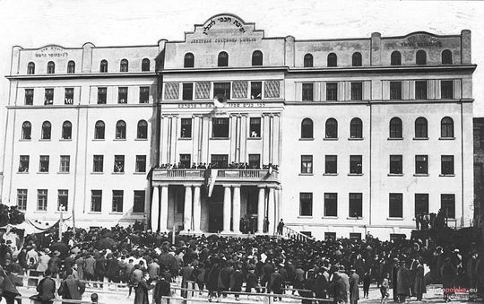 Uczestnicy uroczystości przed budynkiem synagogi Jeszywas Chachmej